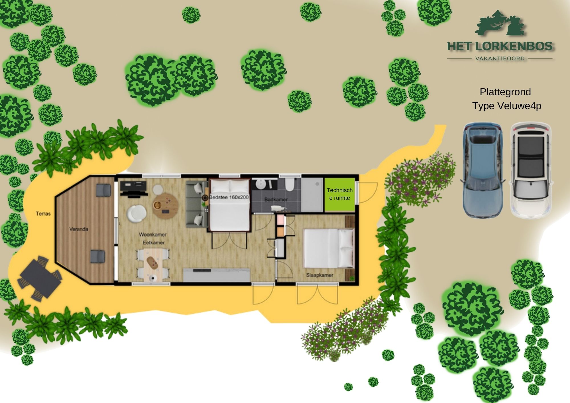 Type 'De veluwe' is een sfeervolle vakantiebungalow voor 4 personen. Het heeft een karakteristieke bedstee, welke enorm populair is onder de kinderen. De ligging is erg rustig tussen de bomen. De bungalow is voorzien van moderne gemakken die we thuis allemaal ook hebben, zoals een tv, vaatwasser, Nespresso, waterkoker en combimagnetron. Daarnaast heeft de bungalow een overdekt terras en een stoep waar je met het tuinset heerlijk geniet van de natuur om je heen. Ook is er vloerverwarming door de gehele bungalow.
